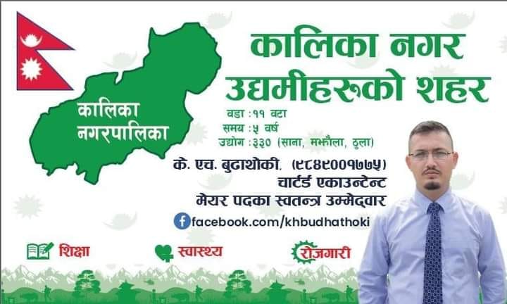 जस्तै लामो समयको अनुसन्धान र परामर्शपछि सिए के.एच बुढाथोकी चितवनको कालिका नगरपालिकाको मेयरको चुनावी प्रतिस्पर्धामा होमिएका छन् । नगरपालिकाको विकाश र सम्बृद्धि हाम्रो मतमै निहित छ,भन्ने मुल नारासहित बुढाथोकी स्वतन्त्र उम्मेदवारीमार्फत चुनावी प्रतिस्पर्धामा होमिएका हुन् ।