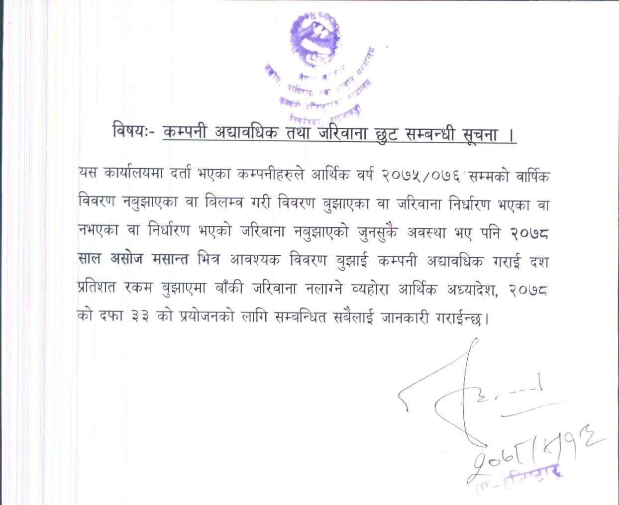 सरकारको पनि व्यवसायीहरुलाई हतोत्साही बनाई उद्यमशीलतालाई नकारात्मक प्रभाव पार्ने नियत हुदैन । ऐन बमोजिम जरिवाना लगाउनु सरकारको कर्तव्य हुन्छ ताकि कम्पनीहरु कानूनी रुपले संचालन हुन सकून् र असल व्यवस्थापन हुन सकोस् । तर पनि साधारण जानकारीको कमीले गर्दा व्यवसायीहरु दिन प्रति दिन जरिवानामा फँसी रहेका हुन्छन् । सरकारले हालै व्यवसायीहरुको हितको लागि आर्थिक अध्यादेश, २०७८ को दफा ३३ मा कम्पनी रजिष्ट्रारको कार्यालयमा दर्ता भएका सम्पूर्ण कम्पनीहरुका लागि हुने गरेर आ।व। २०७५÷२०७६ सम्मको लागि निर्धारण भएका सम्पूर्ण जरिवानाहरुमा ९० प्रतिशत छुटको व्यवस्था गरेको छ, जसको लागि २०७८ असोज मसान्त सम्मको लागि अन्तिम समय प्रदान गरेको छ । सरकारले तोकेकोे समय सीमा सम्मको लागि छुट दिएर त्यसपछि जरिवानामा परेका तथा विवरण नबुझाउने कम्पनीहरुलाई कालो सूचीमा राख्ने वा खोजी गरेर कानून बमोजिम प्रक्रिया अगाडि बढाउन नसक्ला भन्न पनि सकिदैन किनभने सरकारी जरिवानाहरु सरकारले सरकारी असुल उपर सो सरह उठाउन समेत सक्ने अधिकार राख्दछ । माथिका विविध कारणहरुले जरिवानामा परेका कम्पनीका संचालकहरुलाई यो एउटा सुनौलो मौका हो । त्यसकारण जति सक्दो चाँडो आफ्नो कम्पनीलाई अद्यावधिक गराएर मौकाको फाईदा लिनको लागि सम्पूर्ण व्यवसायीहरुलाई मेरो सुझाव रहेको छ । यस कार्यको लागि आपूmसँग पूर्ण ज्ञान नभएको खण्डमा कानून क्षेत्रको विज्ञसँग सल्लाह लिँदा अझ उपयुक्त हुन्छ ।